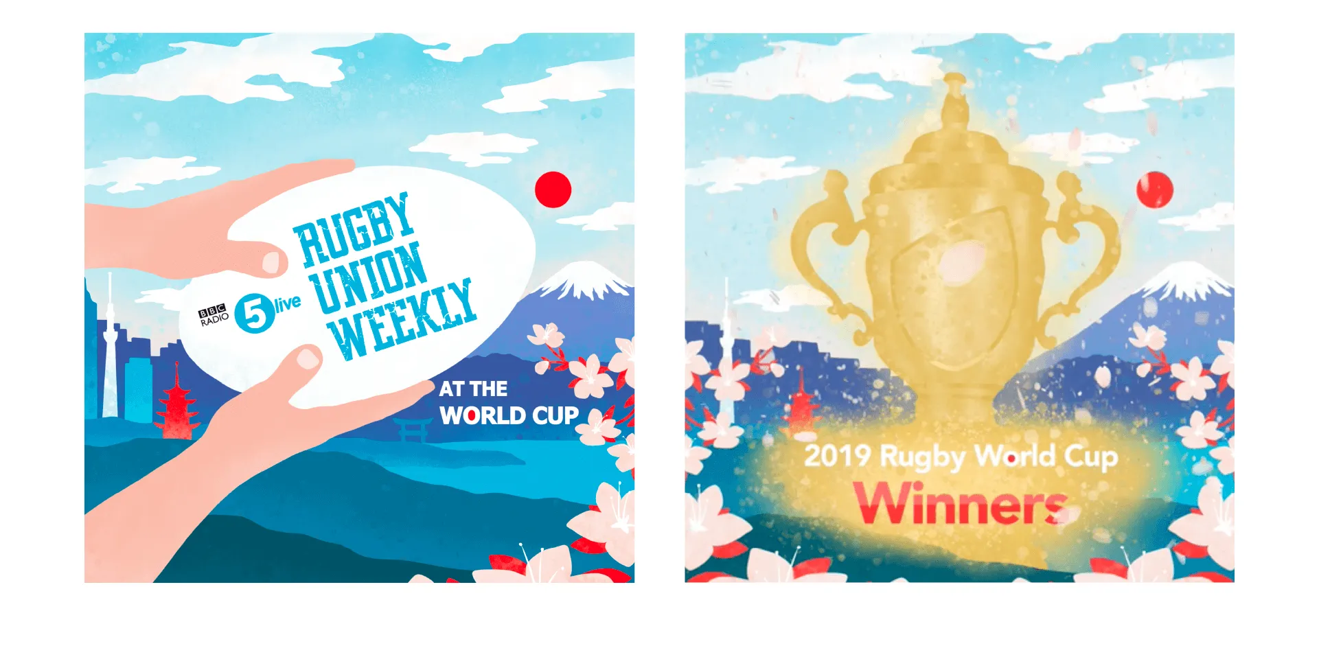 During an internship at BBC radio 5 Live‘s social media department I created an Intro/Outro sequence for the “Rugby Union Weekly“ podcasts reports on the Rugby world cup in Tokyo, as well as a GIF announcing the cup winners.