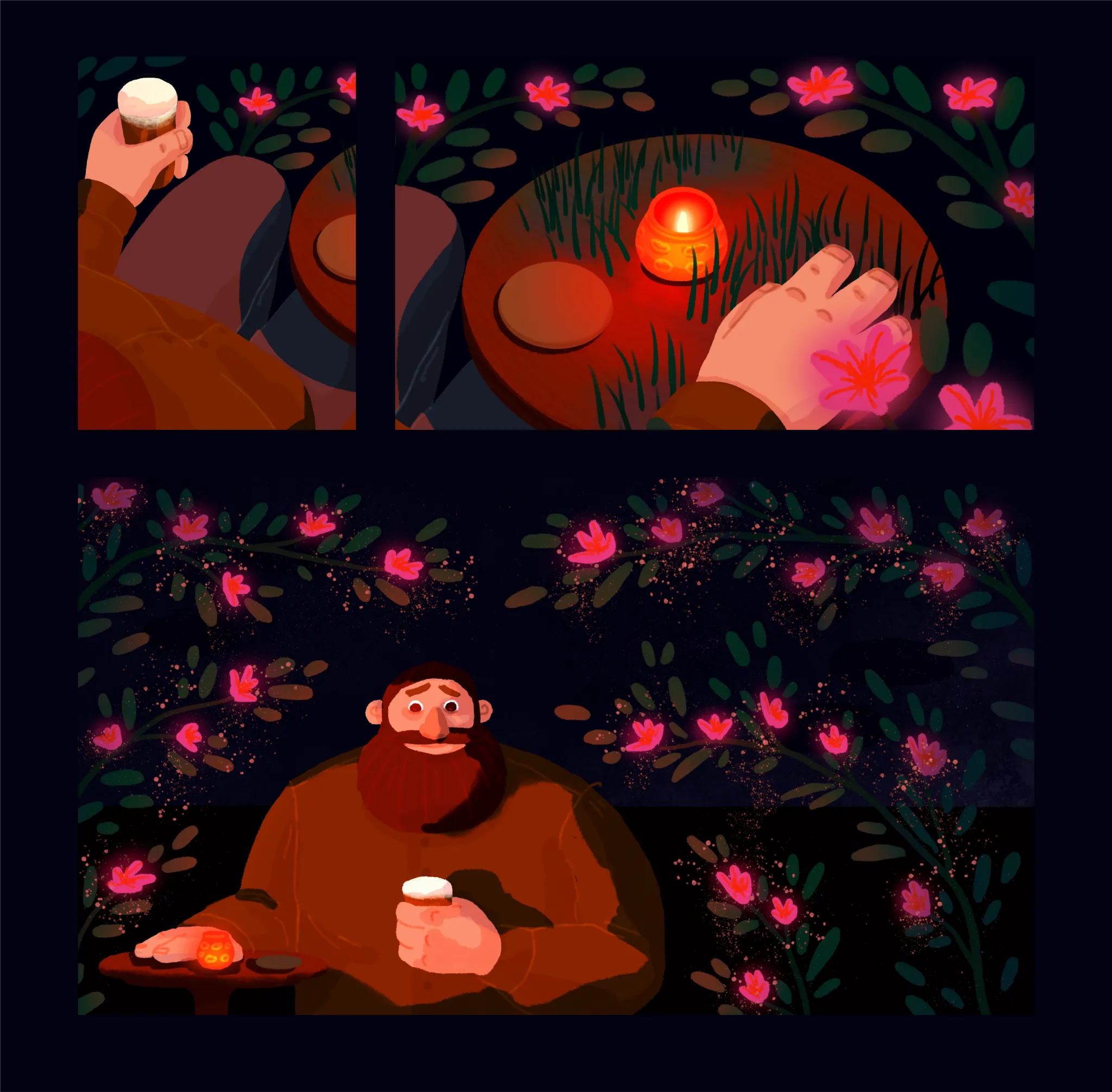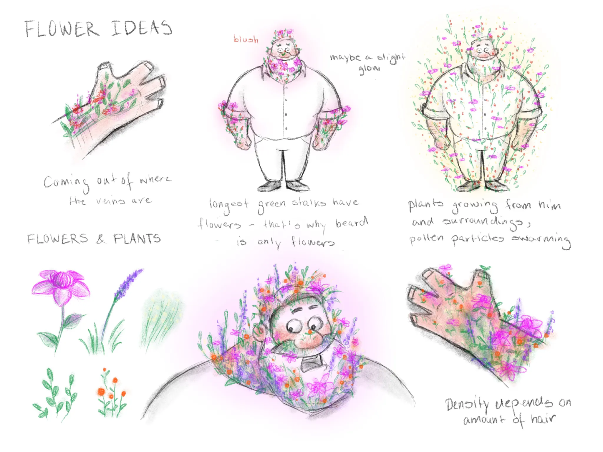 As an arborist the protagonist Alastair has a strong connection to the natural world. When he sees Fergus woodland flora begin to sprout on or around him, giving a visual queue to his desire. Here are some concept pieces I did for these scenes.